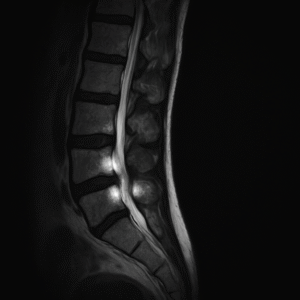 Rechts de scan van de ontstekingen in haar wervelkolom, waardoor mijn schoonmoeder na tientallen jaren van chronische pijn en minachting eindelijk een label en erkenning kreeg (nog niet de echte foto).