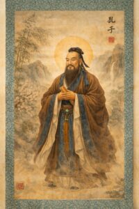 Confuscius (552 – 479 v. Chr.) zag zichzelf niet als schepper, maar als doorgever van ideeen. Hij had veel ontzag voor het verleden. Leefde aan het einde van de Zhou-dynastie, gekenmerkt door oorlogen en politiek-sociale instabiliteit. Hij vond dat de orde zou weerkeren als de hiërarchie en oude waarden werden hersteld.