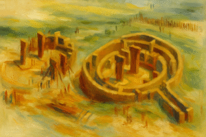 Door het ontstaan van de landbouw worden de concentraties van mensen groter. De wilde dieren verdwijnen, waardoor mannen niet meer kunnen jagen en prestige vergaren. Het bezit van mensen worden groter en ongelijkmatiger verdeeld. Er valt meer buit bij andere dorpen te halen. Paars kan zich niet in grotere groepen organiseren. Het blijft bij overvallen, maar het is de start van het verkrijgen van prestige door andere mannen te doden, buit en vrouwen te roven en het neerzetten van monumentale architectuur. Links: Göbekli Tepe in het huidige Turkije, mogelijk de eerste manosphere.